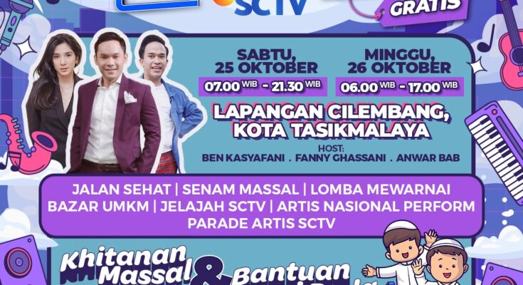 Jakarta – Setelah sukses mengguncang Tasikmalaya pada Oktober 2024 lalu, tahun ini “KARNAVAL SCTV” kembali hadir menyapa warga Tasikmalaya selama dua hari berturut-turut di Lapangan Cilembang, Tasikmalaya. Gelaran akbar ini akan berlangsung pada Sabtu, 25 Oktober 2025 dan Minggu, 26 Oktober 2025, disiarkan LIVE di SCTV sebanyak tiga kali, yakni Sabtu pukul 14.00 WIB serta Minggu pukul 07.00 WIB dan 14.00 WIB, bersama host kesayangan Ben Kasyafani, Fanny Ghassani, dan Anwar BAB.
