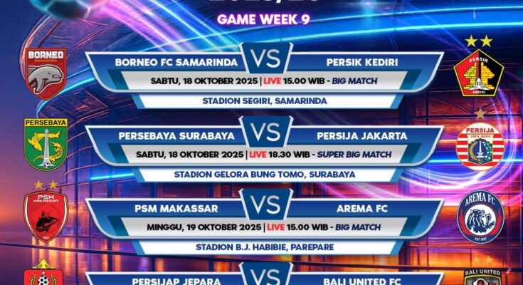 Memasuki pekan ke-9 BRI Super League 2025/26, akhir pekan ini akan dipenuhi laga-laga panas yang siap mengguncang stadion dan layar pemirsa di rumah. Sabtu, 18 Oktober 2025, pertandingan akan dibuka dengan duel BORNEO FC SAMARINDA vs PERSIK KEDIRI di Stadion Segiri, Samarinda pukul 15.00 WIB. Malam harinya, sorotan tertuju pada super big match antara dua tim besar, PERSEBAYA SURABAYA kontra PERSIJA JAKARTA di Stadion Gelora Bung Tomo, Surabaya pukul 18.30 WIB.