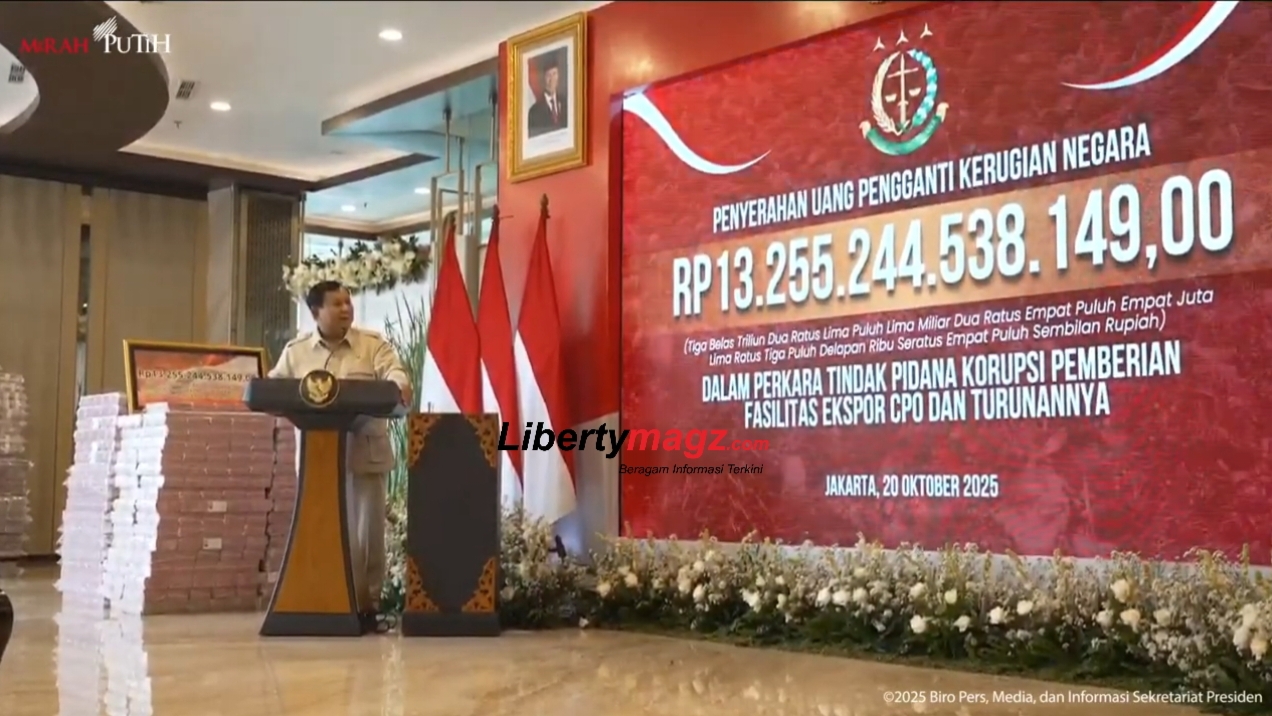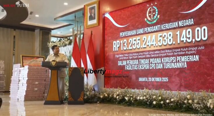 Jakarta — Presiden Prabowo Subianto menghadiri acara penyerahan uang pengganti kerugian negara sebesar Rp13.255.244.538.149 dalam Perkara Tindak Pidana Korupsi Pemberian Fasilitas Ekspor Crude Palm Oil (CPO) Dan Turunannya di Kejaksaan Agung RI, Senin (20/10). Dalam sambutannya, Presiden menyampaikan rasa syukur dan apresiasi kepada seluruh jajaran Kejaksaan Agung yang telah bekerja keras dalam upaya pemberantasan korupsi dan penyelamatan aset negara.