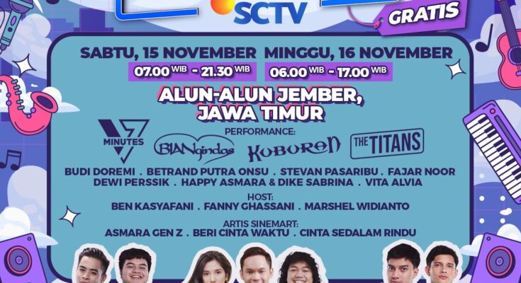 Jakarta – Rangkaian “Karnaval SCTV” kembali hadir menghibur pemirsa setia di berbagai daerah. Kali ini, SCTV akan menyambangi ujung timur Pulau Jawa, tepatnya Kabupaten Jember, selama dua hari berturut-turut, Sabtu, 15 November 2025 hingga Minggu, 16 November 2025.